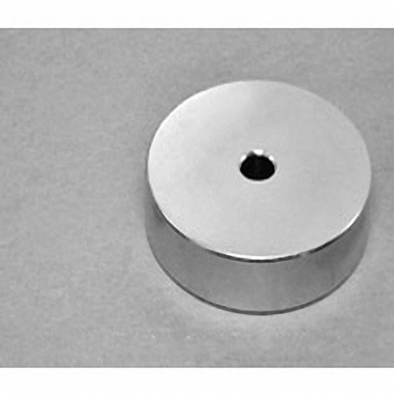 This neodymium countersunk magnet is made of super strong N42 NdFeB (NIB) material, coated with Nickel (Ni+Cu+Ni triple layers). The dimension of this Big neodymium magnet is 1 1/2″ od x 1/4″ id x 1 1/2″ thick, magnetized Diametrical. Its individual pull force is approximately 72.93lbs.