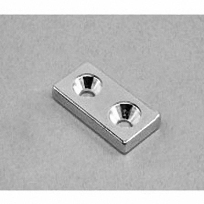 This neodymium countersunk magnet is made of super strong N42 NdFeB (NIB) material, coated with Nickel (Ni+Cu+Ni triple layers). The dimension of this Small neodymium magnet is 1″ x 1/2″ x 1/8″ thick, magnetized Through Thickness. Its individual pull force is approximately 9.19lbs.