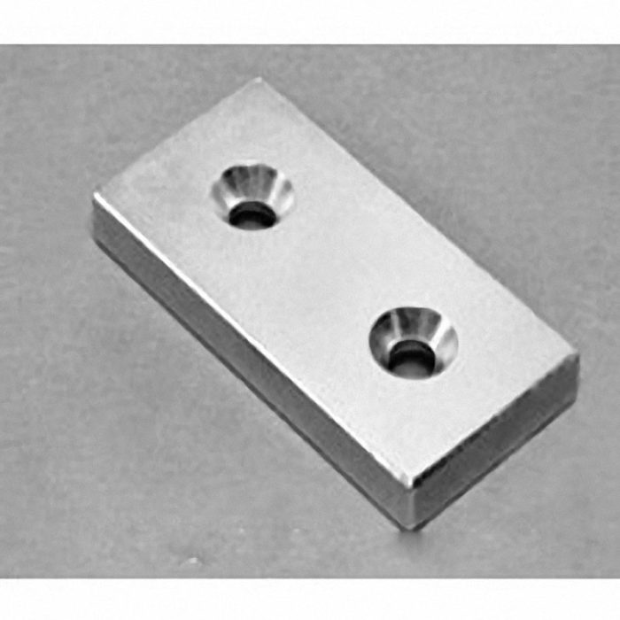 This neodymium countersunk magnet is made of super strong N52 NdFeB (NIB) material, coated with Nickel (Ni+Cu+Ni triple layers). The dimension of this Big neodymium magnet is 2″ x 1″ x 1/4″ thick, magnetized Through Thickness. Its individual pull force is approximately 44.66lbs.