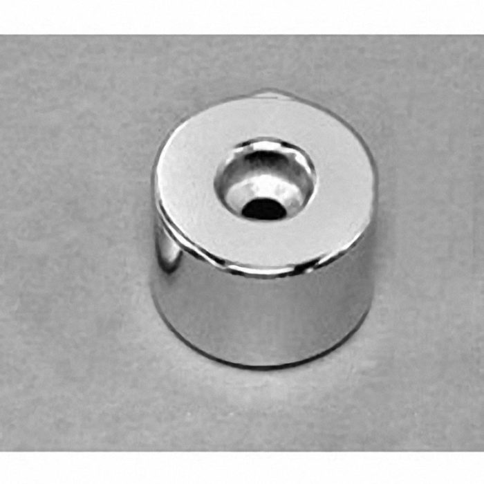 This neodymium countersunk magnet is made of super strong N52 NdFeB (NIB) material, coated with Nickel (Ni+Cu+Ni triple layers). The dimension of this Big neodymium magnet is 1″ od x 0.195″ id x 0.375″ id x 1/2″ thick, magnetized Through Thickness. Its individual pull force is approximately 49.06lbs.